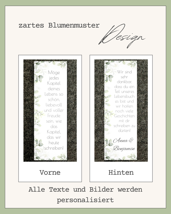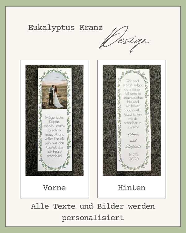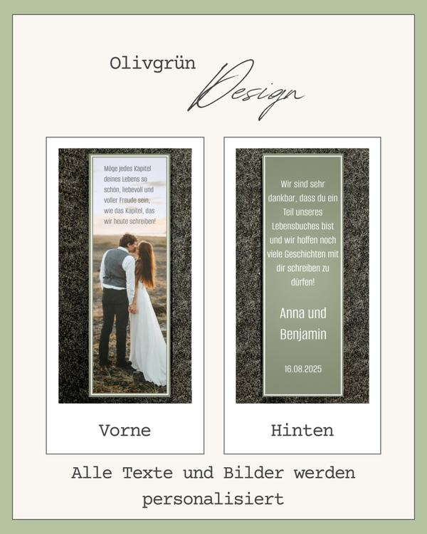 Dieses personalisierte Lesezeichen ist mehr als nur Papier – es ist ein liebevolles Andenken an euren großen Tag. Mit Foto, Wunschtext und in verschiedenen Designs wird jedes Exemplar zu einem ganz persönlichen Kapitel eurer Liebesgeschichte.