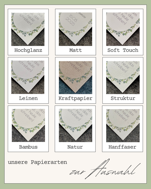 Bitte alle Personalisierungswünsche hier eintragen. Vor dem endgültigen Druck bekommst du ein Muster per PDF, erst wenn du das bestätigt hast wird produziert!